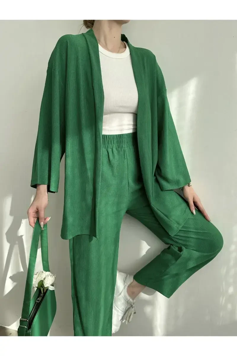 Женский костюм-кимоно, зеленый брючный костюм, вязаный костюм, брюки-клеш, удобный элегантный костюм, повседневная одежда, комплект для особого случая, акриловый костюм, женская одежда, кимоно с брюками