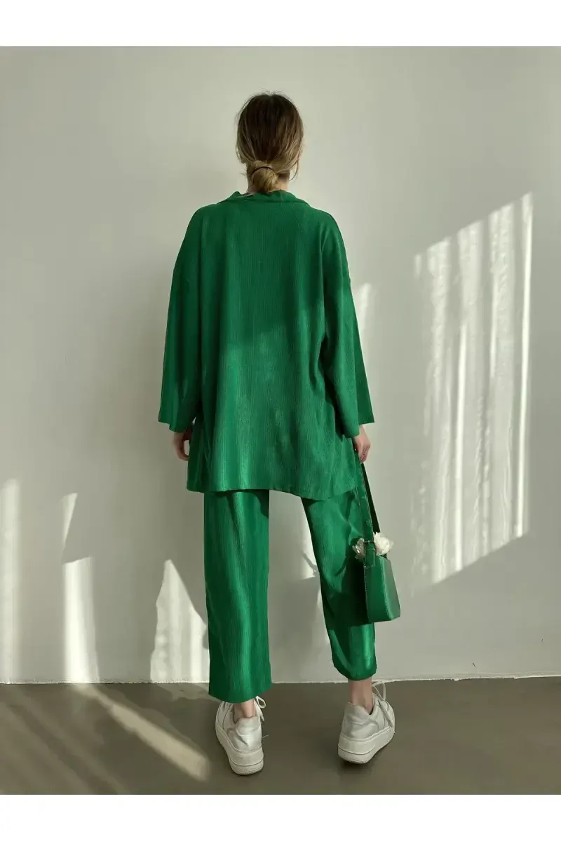 Женский зеленый вязаный комплект кимоно с брюками - это обязательный предмет гардероба современной женщины, сочетающий в себе элегантность и комфорт. Этот комплект - отличный выбор, который дополнит ваш стиль как в повседневной жизни, так и в особых случаях.**Описание продукта**С женским зеленым вязаным комплектом кимоно с брюками вы можете выглядеть стильно, не жертвуя комфортом, и отражать свой стиль, создавая различные комбинации. Вязаная ткань комплекта обеспечивает комфортное ношение в течение всего дня, а крой кимоно и широкие брюки не ограничивают вашу свободу движений. Зеленый цвет представляет собой естественность и жизненную силу и является вневременным вариантом, который может адаптироваться к любой среде. Вы можете обогатить свой стиль, комбинируя его отдельно или с различными аксессуарами.Этот комплект разработан в соответствии с образом жизни современной женщины. Он достаточно удобен, чтобы носить его, выходя из дома утром, и достаточно эффектен, чтобы позволить вам выглядеть шикарно, когда вы идете на ужин. Верх кимоно легко и плавно сидит на вашем теле, а свободный крой брюк обеспечивает свободу движений. Дышащая структура вязаной ткани предотвращает потоотделение и позволяет вам оставаться свежим в течение всего дня.Зеленый цвет комплекта отражает свежесть и энергию природы. Этот цвет добавляет яркости вашим нарядам, а также обеспечивает спокойный и умиротворяющий вид. Вы можете создать повседневный образ, сочетая комплект с белой футболкой и кроссовками, или посетить специальное мероприятие с туфлями на каблуках и стильной сумкой. Вы можете персонализировать свой стиль с помощью выбора аксессуаров и получить разные образы.Женский зеленый вязаный комплект кимоно с брюками не только предлагает стильный внешний вид, но и обеспечивает практичное использование. Благодаря устойчивой к сминанию вязаной ткани она не требует глажки и всегда позволяет вам выглядеть ухоженно. Его можно легко сложить и носить с собой в путешествиях. Таким образом, вы можете сохранить свой стиль, куда бы вы ни пошли. Этот комплект станет незаменимой частью вашего гардероба, и вы всегда захотите держать его под рукой.Этот комплект разработан в соответствии с любым типом фигуры с различными вариантами размера. Правильно выбрав свой размер, вы можете получить внешний вид, который идеально вам подходит и наилучшим образом подчеркивает ваши изгибы. Кроме того, благодаря качеству и долговечности комплекта, вы можете наслаждаться им долгие годы. Он сохранит свой стильный и новый внешний вид, как и в первый день, без таких проблем, как выцветание цвета или деформация. Женский зеленый вязаный комплект кимоно с брюками - отличный подарок как для себя, так и для своих близких. Вы можете сделать их счастливыми, предложив им элегантность и комфорт вместе.**Характеристики продукта*** Стильный и удобный дизайн* Вязаная ткань* Верх кимоно* Широкие брюки* Зеленый цвет**Дополнительная информация**Размер модели S/36. Состав продукта: 100% акрил. Машинная стирка при 30 градусах. Можно гладить при низкой температуре. Не используйте отбеливатель. Возможна сухая чистка.