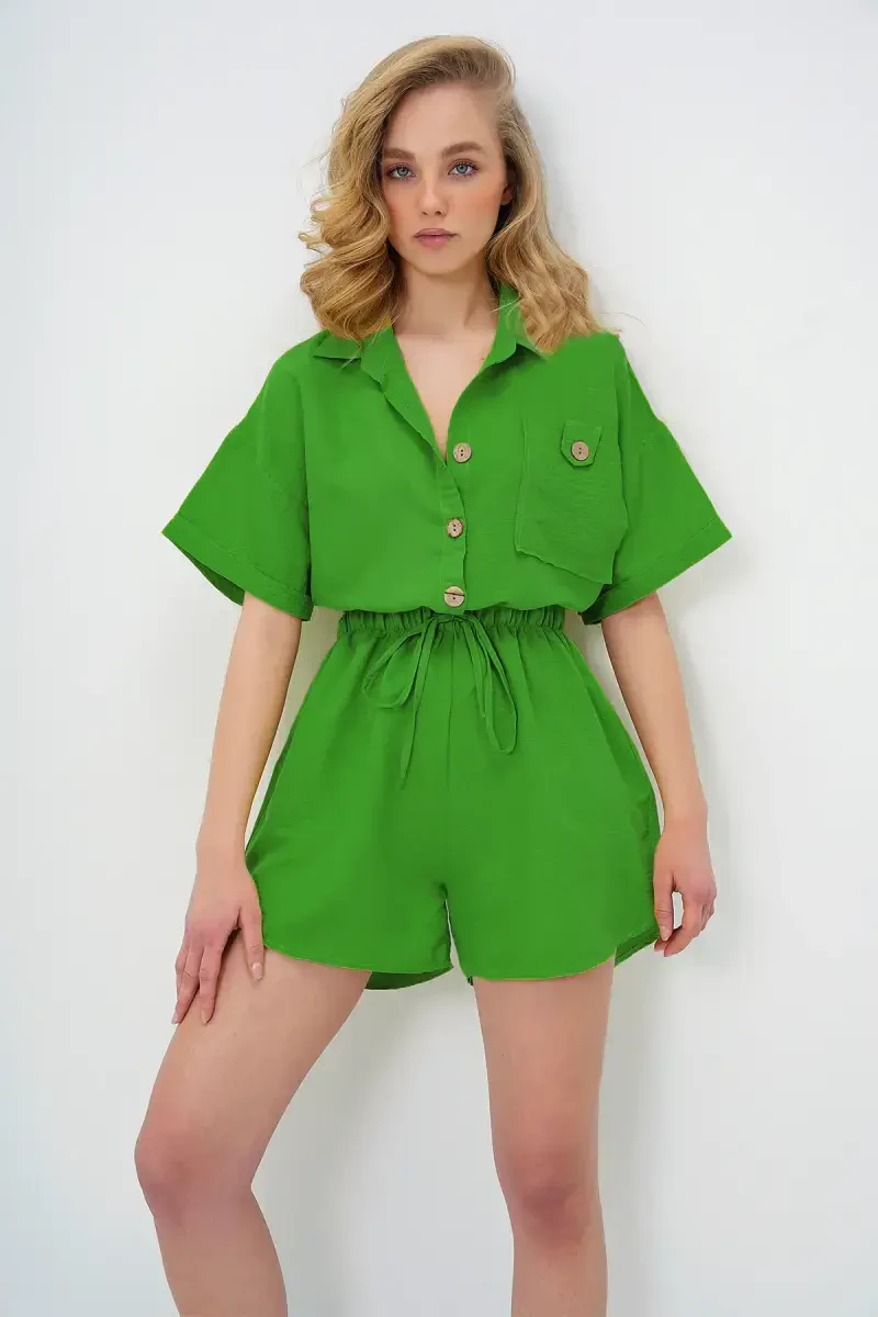 Женский зеленый комбинезон с шортами, рубашечным воротником и двумя карманами ALC-X11611-YEŞİL, который станет незаменимым атрибутом летнего сезона, сочетая в себе элегантность и комфорт, станет одним из самых ярких предметов вашего гардероба. Этот комбинезон с современным дизайном и ярким зеленым цветом привлекает внимание, а рубашечный воротник придает повседневному образу изысканный вид. Два кармана добавляют стильный акцент и обеспечивают удобство использования. Благодаря высококачественной ткани, этот комбинезон обеспечивает комфорт в течение всего дня и является идеальным выбором для женщин, которые хотят выглядеть стильно и чувствовать себя комфортно в жаркую погоду. Легко комбинируется с различными аксессуарами. Вы можете создать более непринужденный и динамичный образ, надев спортивную обувь, или более элегантный и изысканный стиль с туфлями на каблуках. Подчеркните свою фигуру с помощью ремня на талии и дополните свой образ стильной сумкой и украшениями. Это не просто одежда, это способ выразить свой стиль. В этом комбинезоне вы будете привлекать внимание в любой обстановке и повысите свою уверенность в себе. Не упустите возможность обновить свой летний гардероб и добавить элегантности своему образу! Этот комбинезон, разработанный с вниманием к каждой детали, является идеальным выбором для женщин, которые ценят как комфорт, так и элегантность. Наслаждайтесь летом с энергией зеленого цвета!