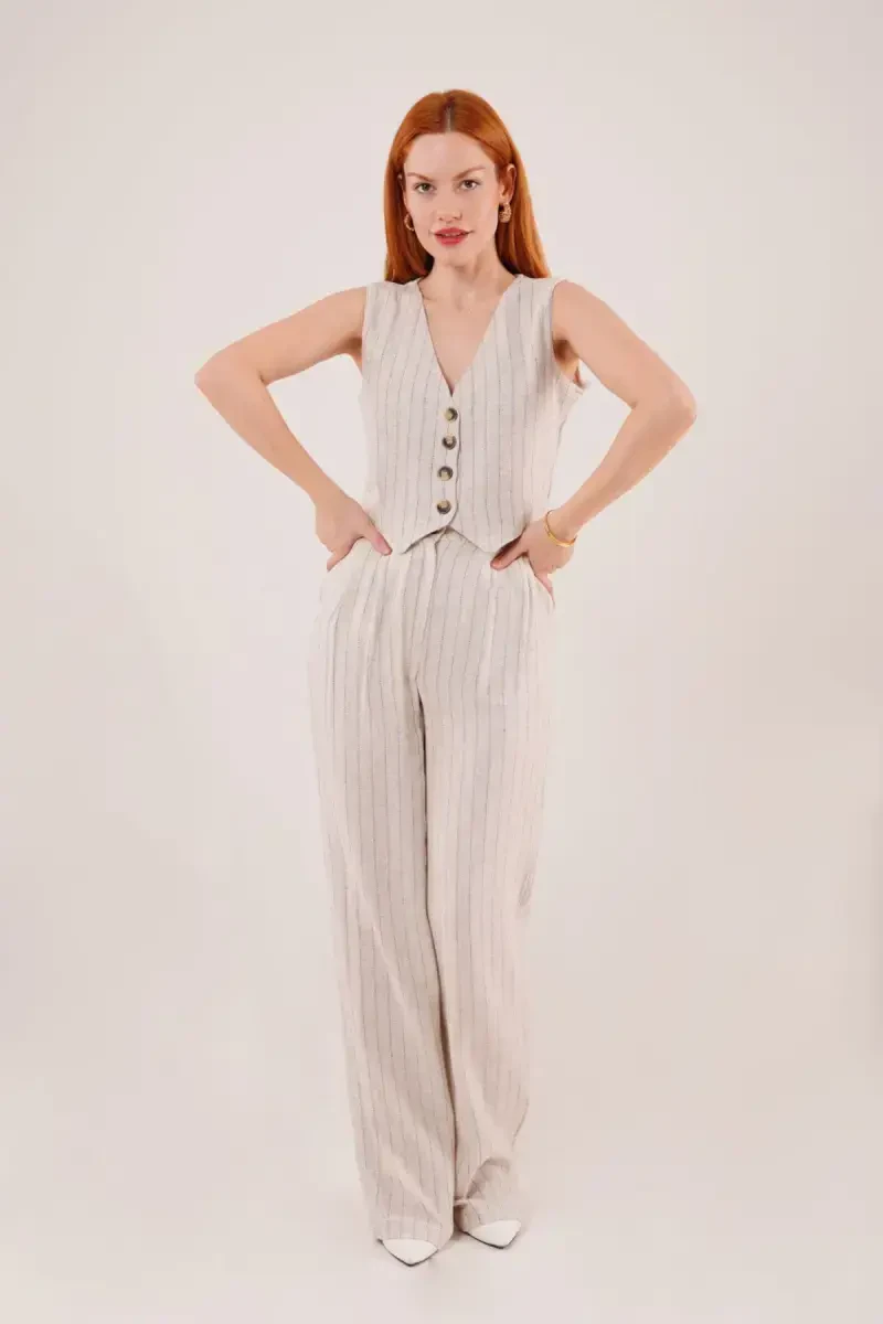 Женский комплект из 2 предметов: жилет и брюки от Lokadi, бежевого цвета, станет незаменимым дополнением вашего гардероба. Этот комплект идеально подходит для женщин, которые хотят быть стильными и чувствовать себя комфортно в жаркие летние дни. Высокая посадка обеспечивает комфорт, а также подчеркивает фигуру. Отсутствие ремня придает комплекту современный и лаконичный вид, не ограничивая свободу движений. Ткань из смеси льна предотвращает потоотделение в летние месяцы, позволяя вам оставаться свежей в течение всего дня. Двойные карманы на брюках комплекта предлагают практичное решение для ношения с собой мелких предметов, необходимых в повседневной жизни. Благодаря стандартному крою, комплект удобно сидит по фигуре, не сковывая движений. Полосатый узор придает комплекту неподвластный времени шик. Этот комплект можно носить как на деловую встречу, так и на повседневную прогулку. Это универсальная вещь, которая может адаптироваться к разным стилям. Этот продукт, представленный в виде комплекта из жилета и брюк, является идеальным выбором для женщин, которые ищут одновременно элегантность и комфорт. Жилет без рукавов позволит вам оставаться прохладной в летние месяцы и добавит современный штрих вашему образу. Неуказанный тип ткани позволяет обогатить изделие альтернативными вариантами с разными текстурами. Таким образом, у вас есть свобода выбора того, что лучше всего подходит вашему стилю. Этот комплект, предназначенный для женщин и девушек, станет стильным и практичным выбором, который понравится женщинам всех возрастов. Цена на продукт, который вы просматриваете, определяется продавцом. Один продукт может быть продан несколькими продавцами. Продавцы продуктов, предлагаемых для продажи более чем одним продавцом, ранжируются в соответствии с ценой, установленной ими для продукта, баллами продавца, статусом доставки, рекламными акциями на продукты, является ли доставка бесплатной и может ли продукт быть доставлен с быстрой доставкой, а также информацией о запасах и категориях продуктов. С этого продукта можно заказать не более 10 штук. Trendyol оставляет за собой право отменить заказы, превышающие 10 единиц. Это ограничение не распространяется на корпоративные заказы, и для корпоративных заказов могут быть установлены другие лимиты. Предлагается бесплатный возврат в течение 15 дней.