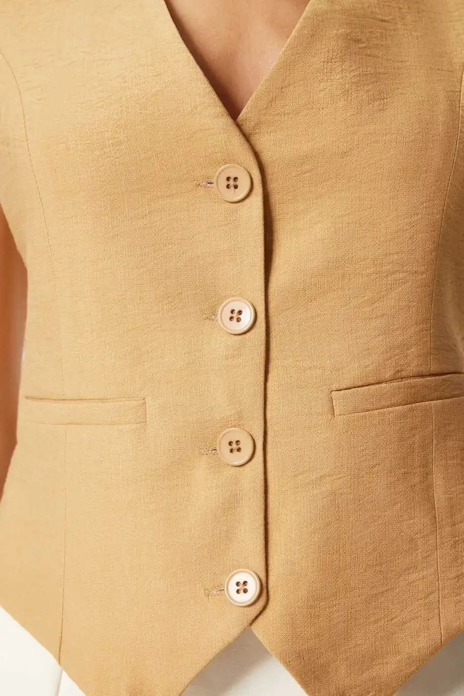 Стильный жилет Camel V-образного выреза для женщин TO00067 — это прекрасное сочетание стиля и комфорта. Этот жилет, отправляемый Trendyol, предлагается по выгодной цене благодаря наличию более 10 единиц на складе. Поскольку он может продаваться несколькими продавцами, цена, рейтинг продавца, срок доставки и информация о доставке могут отличаться. При заказах более 10 единиц Trendyol оставляет за собой право на отмену. Для корпоративных заказов могут действовать другие ограничения. Возврат товара возможен в течение 15 дней бесплатно. Более подробная информация приведена в условиях возврата. Благодаря базовому силуэту и прямому крою этот жилет подходит к любому вашему наряду. Мягкая и прочная ткань из смеси хлопка и полиэстера обеспечивает комфорт в течение всего дня. Благодаря классическому крою он обеспечивает удобную посадку и полную свободу движений. Подкладка добавляет дополнительное тепло и комфорт, а также подчеркивает стиль. Вневременной однотонный дизайн легко сочетается с одеждой любого цвета и рисунка. Благодаря своему дизайну, он подходит для всех возрастных групп. Укороченный крой создает современный и стильный образ, идеально подходящий для повседневной носки. Практичные карманы повышают функциональность и добавляют динамичный штрих к стилю. Стандартный тип рукава и застежка на пуговицах обеспечивают как классический, так и практичный дизайн. V-образный вырез придает стильный вид и элегантно подчеркивает зону декольте. Этот жилет обещает стать незаменимой вещью в вашем гардеробе!