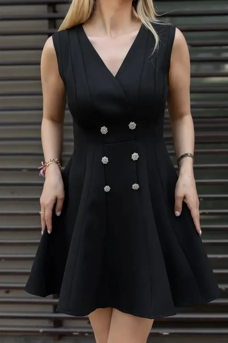 Kadın Düğme Detaylı Kolsuz Kruvaze Yaka Siyah Kloş Abiye Elbise Mezuniyet Elbisesi, zarafeti ve şıklığı bir araya getiren özel bir tasarımdır. Klasik ve zamansız tasarımıyla her yaş grubuna hitap eden bu siyah kruvaze yaka abiye elbise, özel günlerinizde ve mezuniyet törenlerinizde şıklığınızı ön plana çıkaracak. Midi boy kesimi sayesinde hem rahatlık hem de zarif bir görünüm sunarken, hareket özgürlüğünüzü kısıtlamaz. Düğmeli detayları ve kolsuz tasarımı ile modern ve sofistike bir stil yaratırken, vual dokuma kumaşı hafifliği ve zarafetiyle konforlu bir kullanım sağlar. Pamuk ve polyester karışımından oluşan materyali sayesinde dayanıklılık ve yumuşaklık sunarken, iç göstermeyen yapısıyla da rahatlık sağlar. Regular kalıp ile vücut hatlarınıza uyum sağlayarak rahat bir oturuş sunarken, A-line silueti sayesinde feminen hatları ön plana çıkarır. Kruvaze yaka tasarımı ile dekolte bölgesini zarifçe vurgular ve standart kol tipiyle günlük kullanım için de idealdir. Düz deseniyle sadelikten yana olanların tercihi olan bu elbise, fermuarlı kapama şekliyle pratik bir kullanım sunar. Mezuniyet balosundan özel davetlere kadar her türlü etkinlikte göz kamaştırmak isteyen kadınlar için mükemmel bir seçimdir. Siyahın asaletini ve kruvaze yakanın zarafetini bir araya getiren bu abiye elbise, gardırobunuzun vazgeçilmez bir parçası olacak. Elbisenin kumaş kalitesi, dikiş detayları ve genel tasarımı, uzun ömürlü bir kullanım sunar. Şıklığınızı ve zarafetinizi ön plana çıkarırken, aynı zamanda konforunuzdan da ödün vermemenizi sağlar. Hem klasik hem de modern tarzı bir arada sunan bu elbise, farklı aksesuarlar ve ayakkabılarla kolayca kombinlenebilir. İster topuklu ayakkabılarla şık bir görünüm elde edin, ister sandaletlerle daha rahat bir stil yaratın, bu elbise her durumda size eşlik edecektir. Kendinizi özel hissetmek ve unutulmaz bir izlenim bırakmak için bu abiye elbiseyi tercih edebilirsiniz.