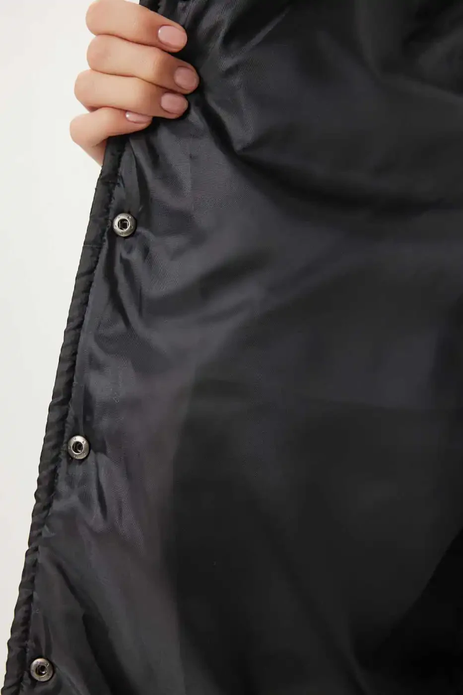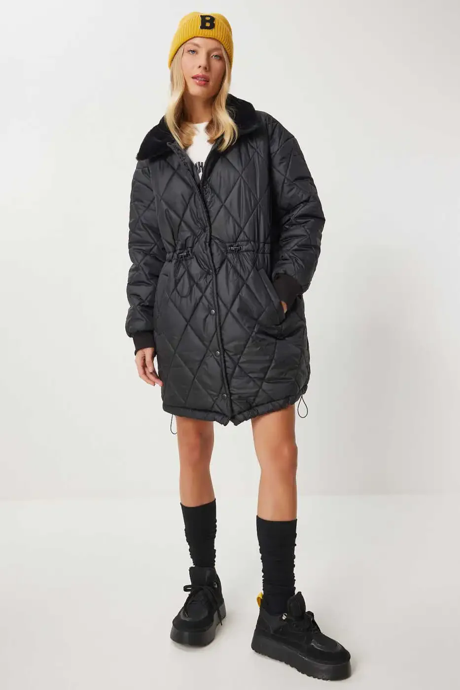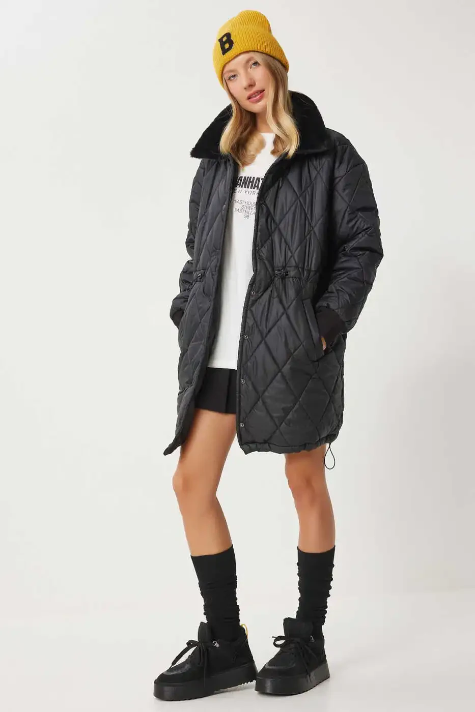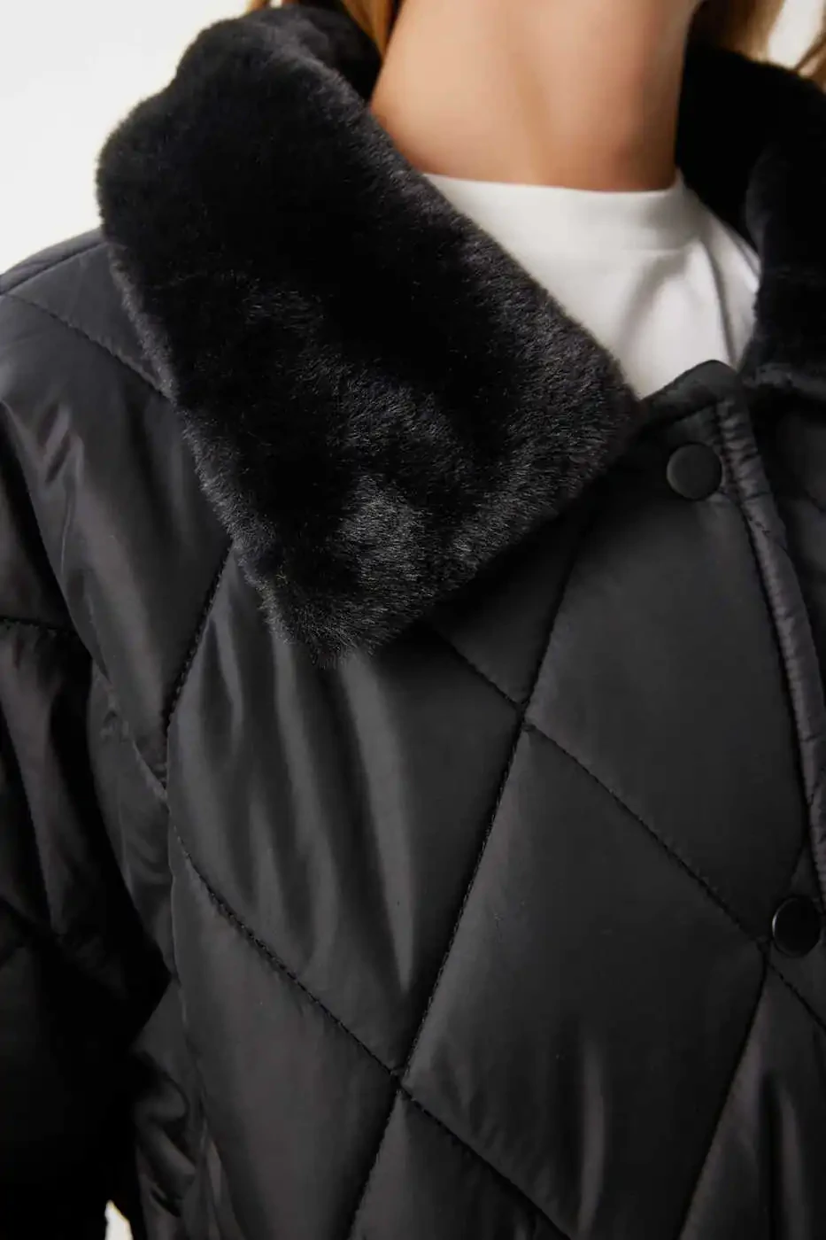 Женское черное стеганое пальто с меховой отделкой | Стильная и теплая зимняя модель PYS0030