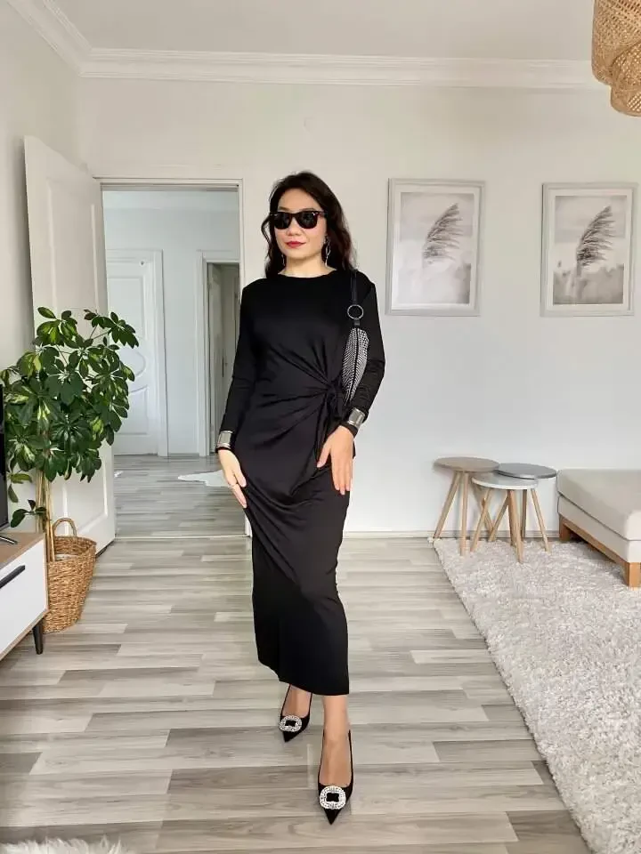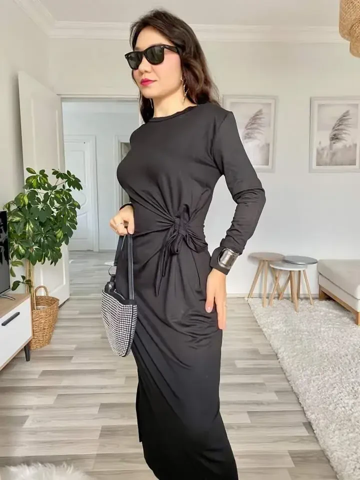 Наслаждайтесь элегантностью и комфортом с женским платьем с длинными рукавами, круглым вырезом, перекрестной завязкой на талии и боковым разрезом из вискозы двойного плетения. Это эксклюзивное платье идеально подходит как для повседневной носки, так и для особых случаев. Мягкая текстура вискозы и двойная вязка обеспечивают комфорт в течение всего дня. Перекрестная завязка на талии элегантно подчеркивает фигуру, создавая стильный силуэт. Боковой разрез придает платью современный и привлекательный вид. Круглый вырез обеспечивает классический и элегантный вид, подходящий для любой обстановки. Благодаря длинным рукавам его можно с комфортом носить в прохладную погоду. На модели изделие размера M/38. Параметры модели: рост: 165 см, вес: 55 кг, грудь: 90 см, талия: 72 см, бедра: 100 см. Эта информация поможет вам выбрать подходящий размер. Универсальный стиль платья легко сочетается с различными аксессуарами и обувью. Создайте повседневный образ со спортивной обувью или перейдите к более шикарному стилю с туфлями на каблуках. Это платье станет одним из незаменимых предметов вашего гардероба и позволит вам всегда чувствовать себя стильно и комфортно. Дышащая структура вискозной ткани двойного плетения предотвращает потоотделение и обеспечивает свежесть в течение всего дня. Длинный крой платья визуально удлиняет ноги и создает элегантный вид. Перекрестная завязка на талии наилучшим образом подчеркивает фигуру, а боковой разрез не сковывает движения. Наслаждайтесь стилем и комфортом с этим платьем. Эта универсальная вещь, которую можно носить в любое время года, станет одной из самых любимых в вашем гардеробе. Естественный блеск вискозы придает платью элегантный вид и позволяет вам привлекать внимание в любой обстановке. С этим платьем вы сможете сохранить свой стиль как днем, так и ночью. Идеальный выбор для особых мероприятий, деловых встреч или повседневных прогулок, чтобы всегда выглядеть безупречно. Драпирующаяся структура платья идеально облегает фигуру и не сковывает движения. Высококачественная вискозная ткань обеспечивает длительный срок службы и не изнашивается. Цветовые варианты платья тщательно подобраны на любой вкус. Это платье, представленное в широкой цветовой гамме, от классических до ярких цветов, легко сочетается с другими предметами вашего гардероба. Подчеркните свой стиль с помощью этого платья и заявите о себе в любой обстановке. Мягкость вискозы и элегантный дизайн платья всегда придадут вам уверенности в себе. Идеальный выбор для женщин, которые хотят быть одновременно комфортными и стильными. Это платье станет одним из основных предметов вашего гардероба и всегда придет вам на помощь.