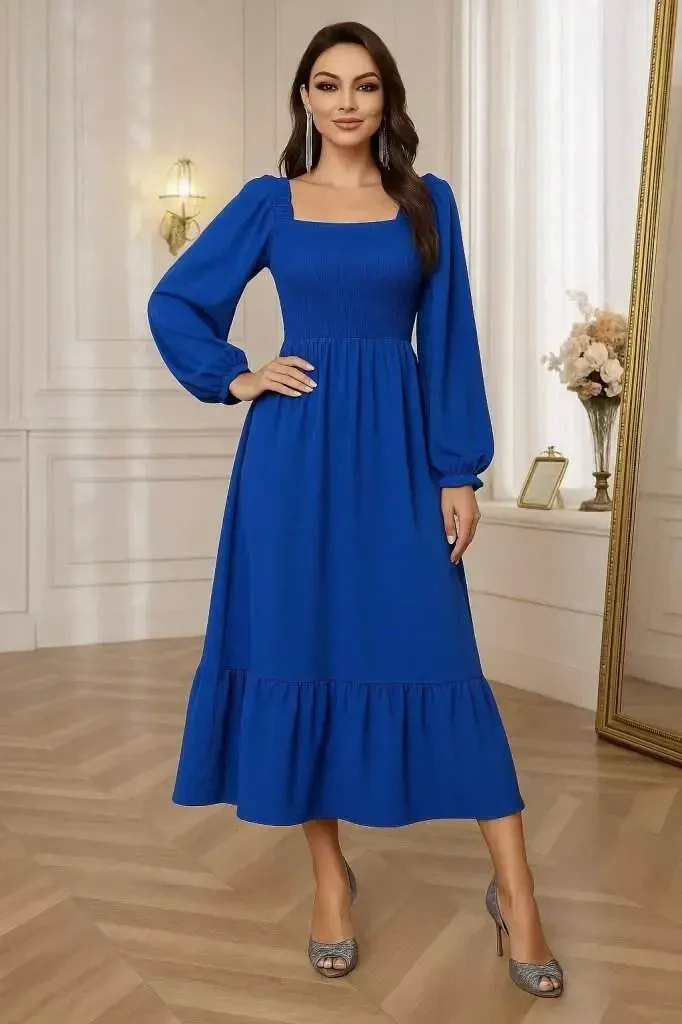 Женское платье, платье с длинными рукавами, платье с квадратным вырезом, платье с оборками, трикотажное платье, длинное платье, элегантное платье, удобное платье, повседневное платье, платье для особого случая