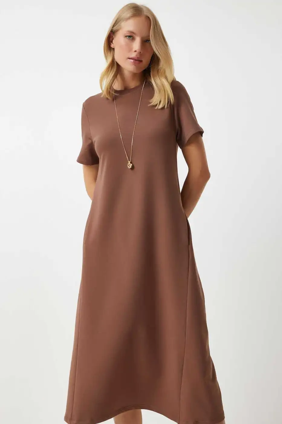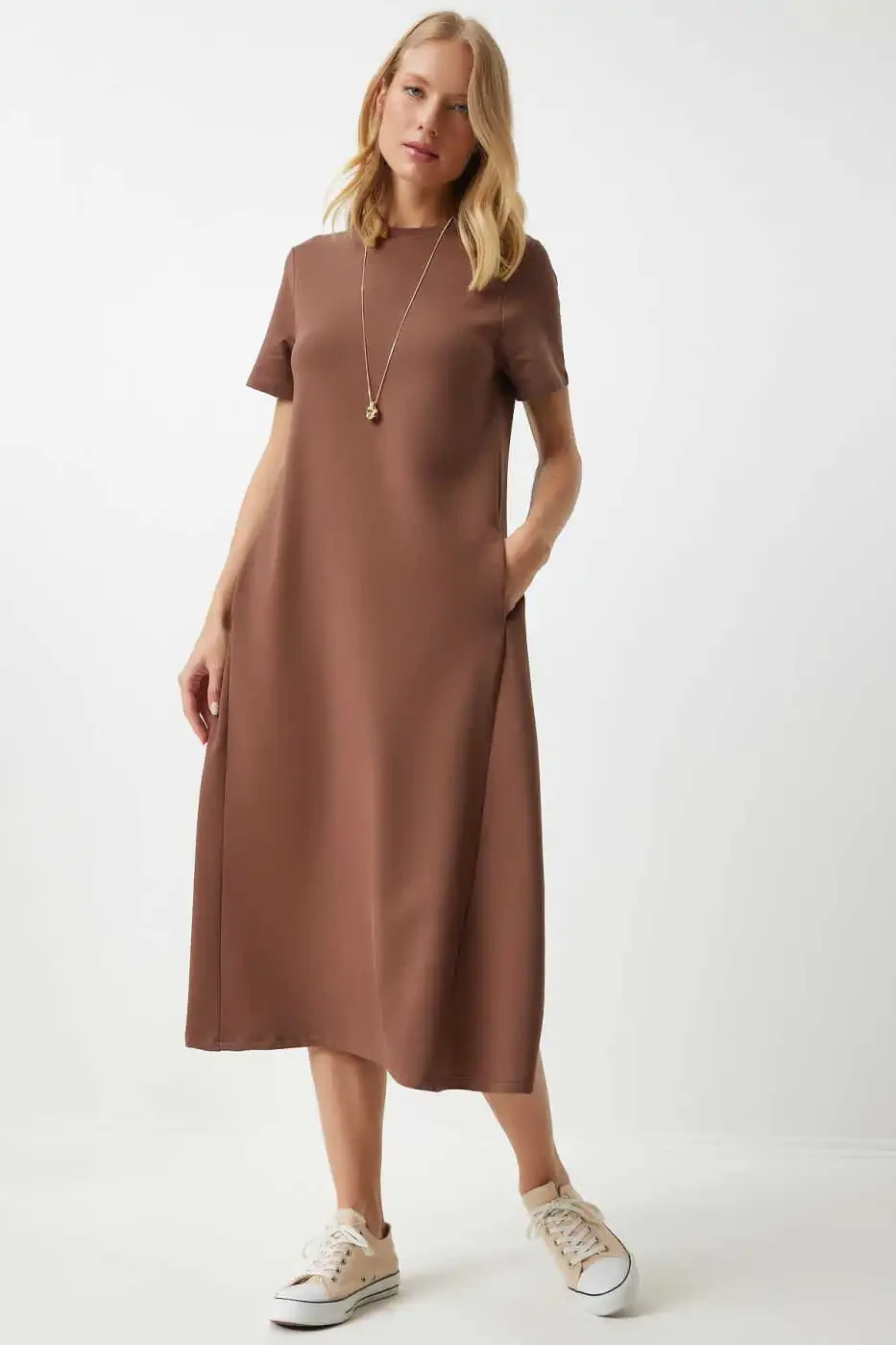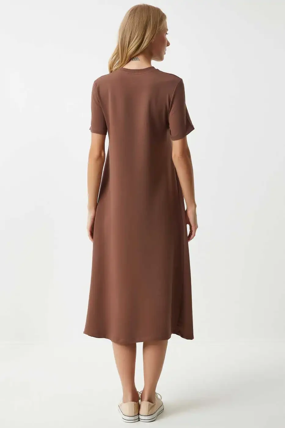 Женское летнее трикотажное платье А-силуэта коричневого цвета UB000 специально разработано для женщин, которые не хотят жертвовать своей элегантностью и хотят чувствовать себя комфортно в течение дня в жаркие летние дни. Одной из самых ярких особенностей платья является крой А-силуэта, который красиво облегает тело. Этот крой изящно подчеркивает фигуру и в то же время не ограничивает свободу движений. Это платье, которое вы можете с комфортом носить во время повседневной суеты или на особом мероприятии, добавит элегантности вашему стилю. Коричневый оттенок платья создает естественный и теплый вид. Коричневый цвет – это цвет, который подходит для любого тона кожи и легко сочетается. Создайте ли вы повседневный образ со спортивной обувью или более элегантный образ с туфлями на каблуке, это платье подойдет для любого случая. Ткань платья, состоящая из 100% хлопкового трикотажа, позволяет вашей коже дышать и предотвращает потоотделение. Таким образом, вы будете чувствовать себя комфортно в течение всего дня даже в жаркую погоду. Мягкая текстура трикотажной ткани нежно соприкасается с вашей кожей и не вызывает дискомфорта. Детали, использованные в дизайне платья, добавят элегантности вашему образу. Круглый вырез горловины создает элегантный вид, а короткие рукава помогают вам оставаться прохладными в летнюю жару. Легкие сборки по низу платья добавляют игривую и энергичную атмосферу. Эти детали отличают платье от обыденности и позволяют создать неповторимый стиль. Женское летнее трикотажное платье А-силуэта коричневого цвета UB000 не только стильное и удобное, но и легко сочетается. Вы можете носить платье отдельно или дополнить его различными аксессуарами. Например, вы можете подчеркнуть свою талию с помощью ремня или выделить декольте с помощью стильного ожерелья. Вы также можете отразить свой собственный стиль, сочетая его с сумками и обувью разных цветов. Это платье станет незаменимой частью вашего летнего гардероба и позволит вам чувствовать себя особенной каждый раз, когда вы его надеваете. Помните, стиль – это не только то, что вы носите, но и то, как вы это носите. Покажите свой стиль наилучшим образом и наслаждайтесь летом с женским летним трикотажным платьем А-силуэта коричневого цвета UB000.