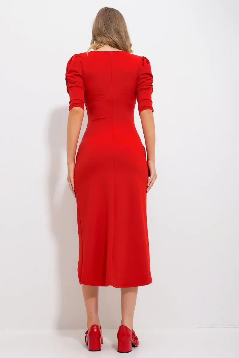 Женское красное платье-коктейль с воротником-шалью и драпировкой, рукав принцессы - отличный выбор для изящного и элегантного образа, которое сделает вас центром внимания на ваших особых мероприятиях. Деталь воротника-шали добавляет женственности, а драпировка придает уникальный стиль. Рукава принцессы добавляют изящный штрих, делая вас еще более особенной.