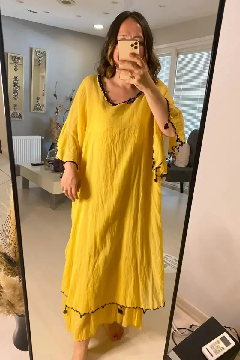 Женское летнее платье-туника из 100% хлопка горчично-желтого цвета | Большие размеры