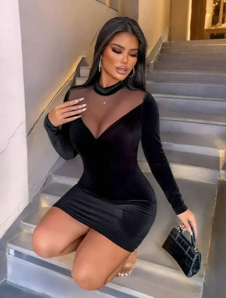 женское платье, с длинными рукавами, с высоким воротом, с тюлевой деталью, мини-платье, бархатное платье, элегантное платье, изящное платье, платье для вечеринок, повседневное платье