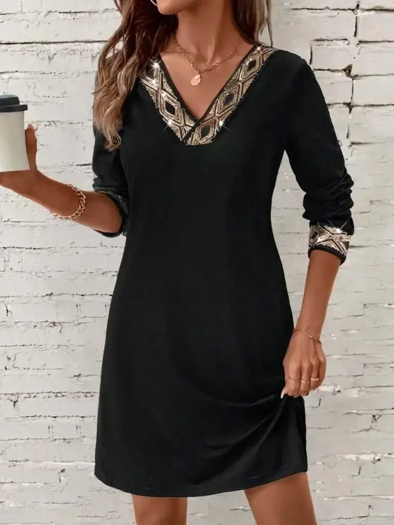 Ощутите элегантность и изящество с женским мини-платьем с длинными рукавами, V-образным вырезом и пайетками из импортного крепа. Это эксклюзивное платье станет незаменимым дополнением вашего гардероба. Легкость и комфорт импортной креповой ткани обеспечивают комфорт в течение всего дня, а детали с пайетками заставят вас блистать в любой обстановке. V-образный вырез добавляет женственности, а длинные рукава делают его стильным и практичным вариантом. Мини-длина позволит вам создать современный и привлекательный образ. Это платье, которое можно носить в самых разных случаях, от особых случаев до повседневной носки, станет лучшим способом выразить свой стиль. На модели изделие размера M/38. Параметры модели: Рост: 165 см, Вес: 55 кг, Грудь: 90 см, Талия: 72 см, Бедра: 100 см. Эти параметры могут дать вам представление о том, как платье будет сидеть на вас. Крой платья наилучшим образом подчеркивает ваши формы и не стесняет движений. Будь то в сочетании с туфлями на каблуках для особого вечера или с кроссовками для более повседневного образа. Это платье легко адаптируется к любому стилю. Детали с пайетками улавливают свет и всегда придают вам сияющий вид. Длинные рукава позволяют комфортно носить его в прохладную погоду. V-образный вырез позволяет персонализировать свой стиль, сочетая его с ожерельями. Мини-длина подчеркивает ваши ноги и создает современный образ. Это платье - идеальный выбор для женщин, которые хотят быть одновременно стильными и удобными. С этим эксклюзивным платьем, которое обязательно должно быть в вашем гардеробе, вы всегда будете привлекать внимание. Качество креповой ткани обеспечивает долговечность, а благодаря простоте глажки это практичный вариант. В этом платье вы всегда будете чувствовать себя особенной и красивой. Это платье, сочетающее в себе стиль и комфорт, станет вашей любимой вещью в гардеробе. Текстура импортной креповой ткани приятна для вашей кожи, а детали с пайетками добавляют платью движения и живости. Это платье позволит вам заявить о своем стиле в любой обстановке.