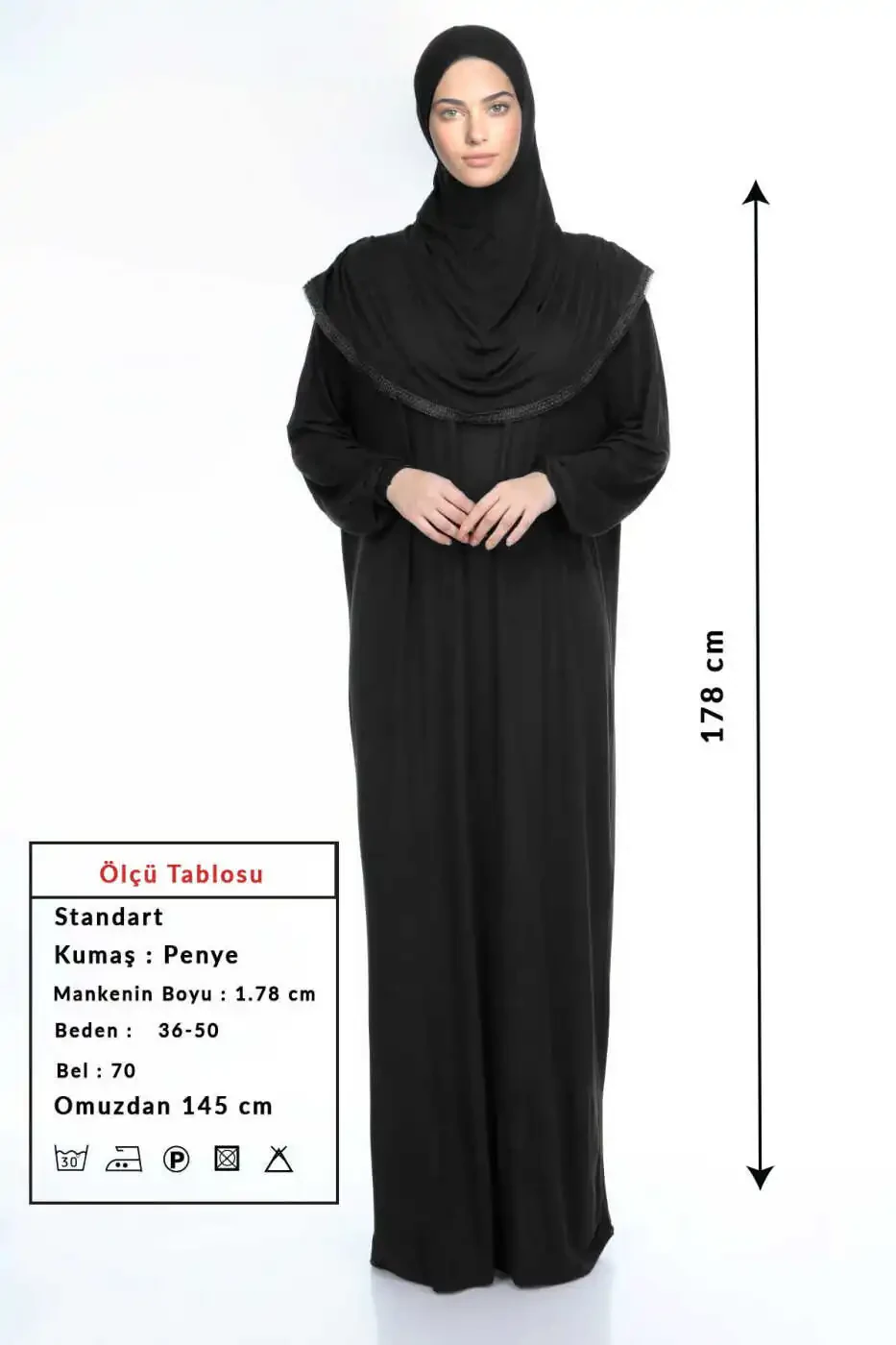 **Женское мусульманское молитвенное платье из хлопка с платком Гипюровое однотонное трикотажное черное** **Характеристики продукта:** * **Материал:** Высококачественный хлопковый трикотаж * **Модель:** Цельное платье с платком * **Цвет:** Черный * **Стиль:** Скромный и элегантный с гипюровыми деталями * **Назначение:** Идеально подходит для молитв и других религиозных мероприятий * **Размеры:** Доступны в нескольких размерах * **Уход:** Машинная стирка, сушка при низкой температуре **Преимущества:** * **Удобный и дышащий:** Хлопковая ткань обеспечивает воздухопроницаемость и комфорт при ношении. * **Платок входит в комплект:** Нет необходимости в отдельном головном платке, что упрощает использование. * **Скромный дизайн:** Платье имеет скромный вид, соответствующий религиозным убеждениям. * **Гипюровая отделка:** Гипюровая отделка добавляет платью нотку элегантности и изысканности. * **Легко надевать:** Цельный дизайн позволяет легко надевать и снимать платье. **Комплектация:** * 1 х Женское мусульманское молитвенное платье из хлопка с платком