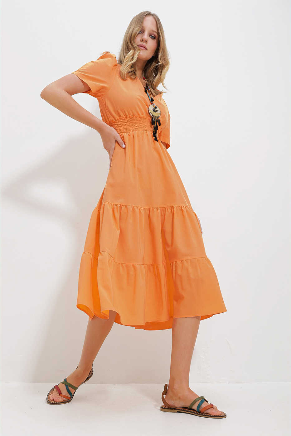Привлекательный оранжевый цвет платья подходит к различным стилям. Вы можете сочетать его со спортивной обувью для повседневного образа или дополнить стильными туфлями на каблуке для вечерних выходов. Пояс на талии платья подчеркивает вашу фигуру, делая вас еще более элегантной.