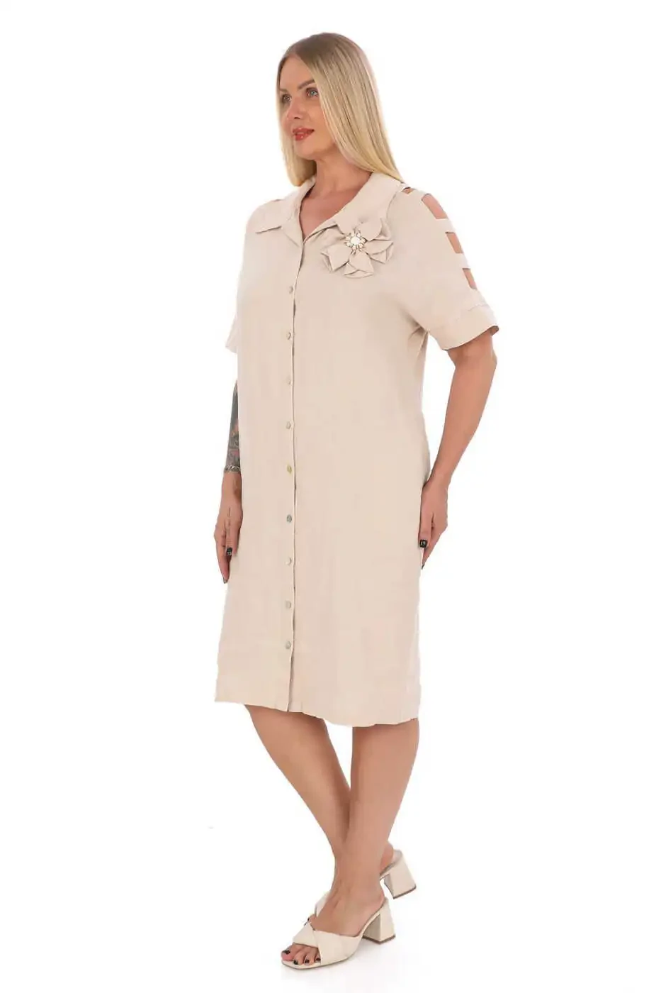 Дополните свой стиль женским льняным платьем большого размера с рубашечным воротником Бежевый и наслаждайтесь комфортом и стилем в жаркие летние дни.
