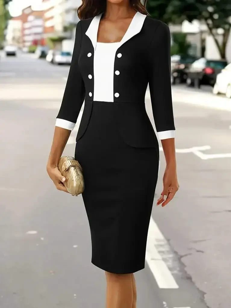 Женское платье, рукав три четверти, кремовое платье, импортное платье, двухцветное платье, платье на пуговицах, короткое платье, элегантное платье, изящное платье, платье особого дизайна