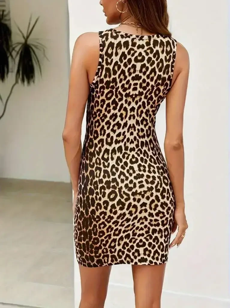 леопардовое платье, женское платье на бретелях, платье из кулирной глади, платье с круглым вырезом, летнее платье, леопардовое платье, мини-платье, повседневное платье, элегантное платье, удобное платье