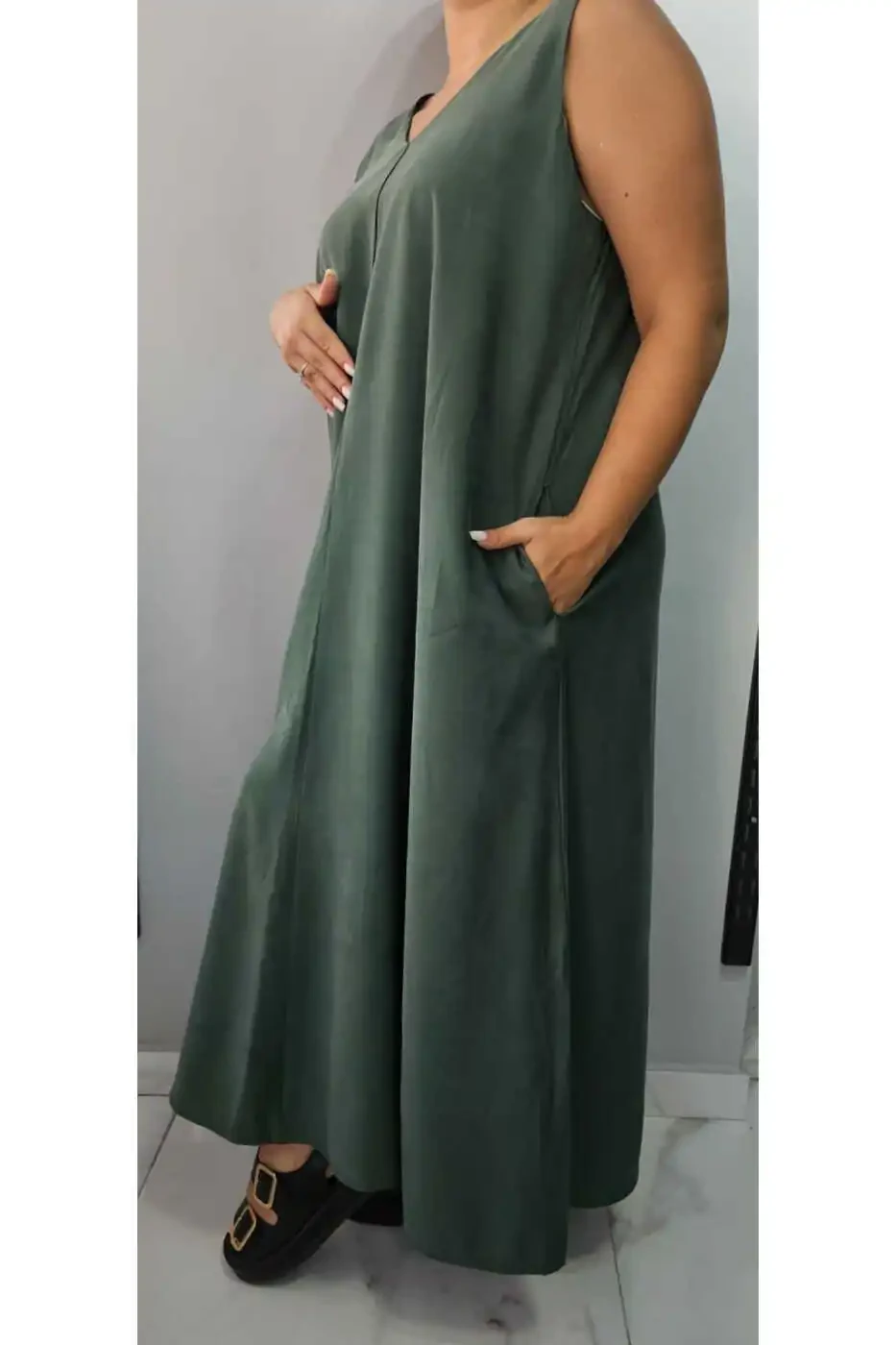 Сочетающее в себе стиль и комфорт, женское платье-макси большого размера без рукавов с V-образным вырезом 24135 станет незаменимой частью вашего гардероба. Платье с V-образным вырезом создает изящный образ, а безрукавный дизайн обеспечивает прохладу в теплую погоду. Его максимальная длина делает ваши ноги длинными и стройными. Платье, которое подходит к любому размеру благодаря своим размерам plus size, поможет вам создать комфортный и стильный образ.