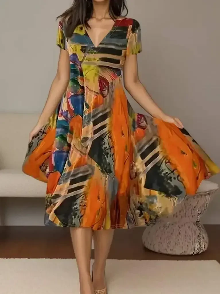 Хлопковое платье-клёш - с принтом, V-образный вырез, короткий рукав