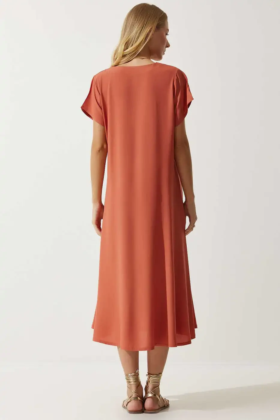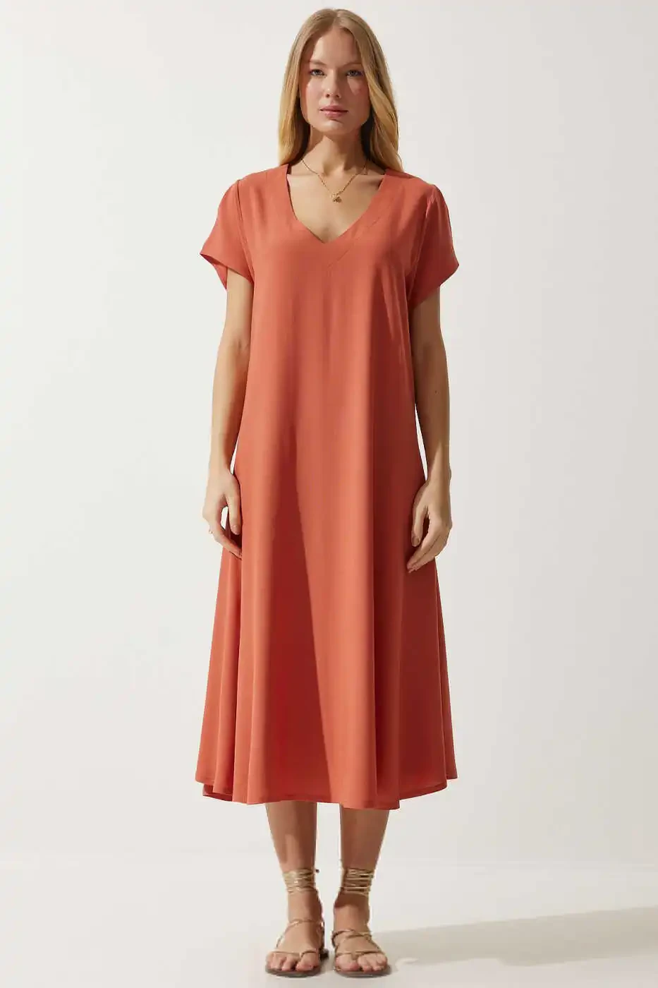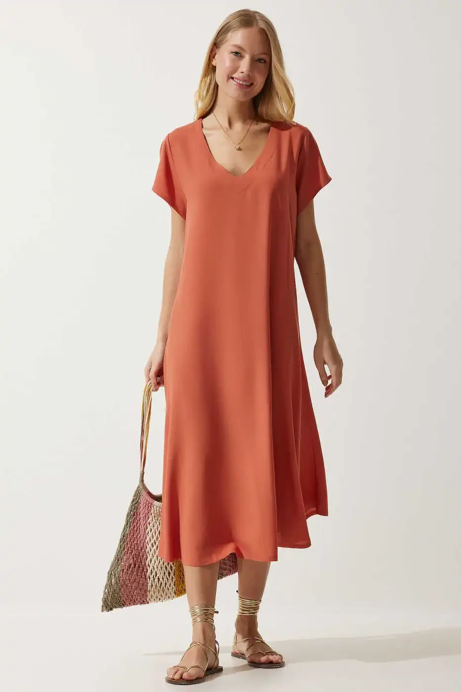 Познакомьтесь с потрясающим платьем, которое подарит вам прохладу и стиль в жаркие летние дни: Женское оранжевое летнее платье из вискозы с V-образным вырезом EN00612! Представленное с гарантией Trendyol, это платье доступно по акционной цене и имеется в наличии более 100 единиц. А-силуэт платья изящно облегает фигуру, создавая женственный и привлекательный образ. Легкая и дышащая шифоновая ткань подарит ощущение комфорта и прохлады в летнюю жару, а длинные рукава сделают его идеальным выбором и для прохладных вечеров. Длина миди позволяет создавать стильный образ как для повседневной носки, так и для особых случаев. Благодаря стандартному крою вы сможете свободно двигаться и чувствовать себя комфортно в течение всего дня. V-образный вырез добавляет элегантности, изящно подчеркивая зону декольте. Изготовленное из смеси 95% вискозы и 5% эластана, это платье отличается прочностью и мягкостью. Идеальный выбор для повседневных ситуаций, это платье станет незаменимой вещью в вашем гардеробе. Вы можете приобрести его без опасений, воспользовавшись возможностью бесплатного возврата в течение 15 дней. Для получения дополнительной информации ознакомьтесь с условиями возврата. Спешите, количество товара ограничено, не упустите это потрясающее платье!