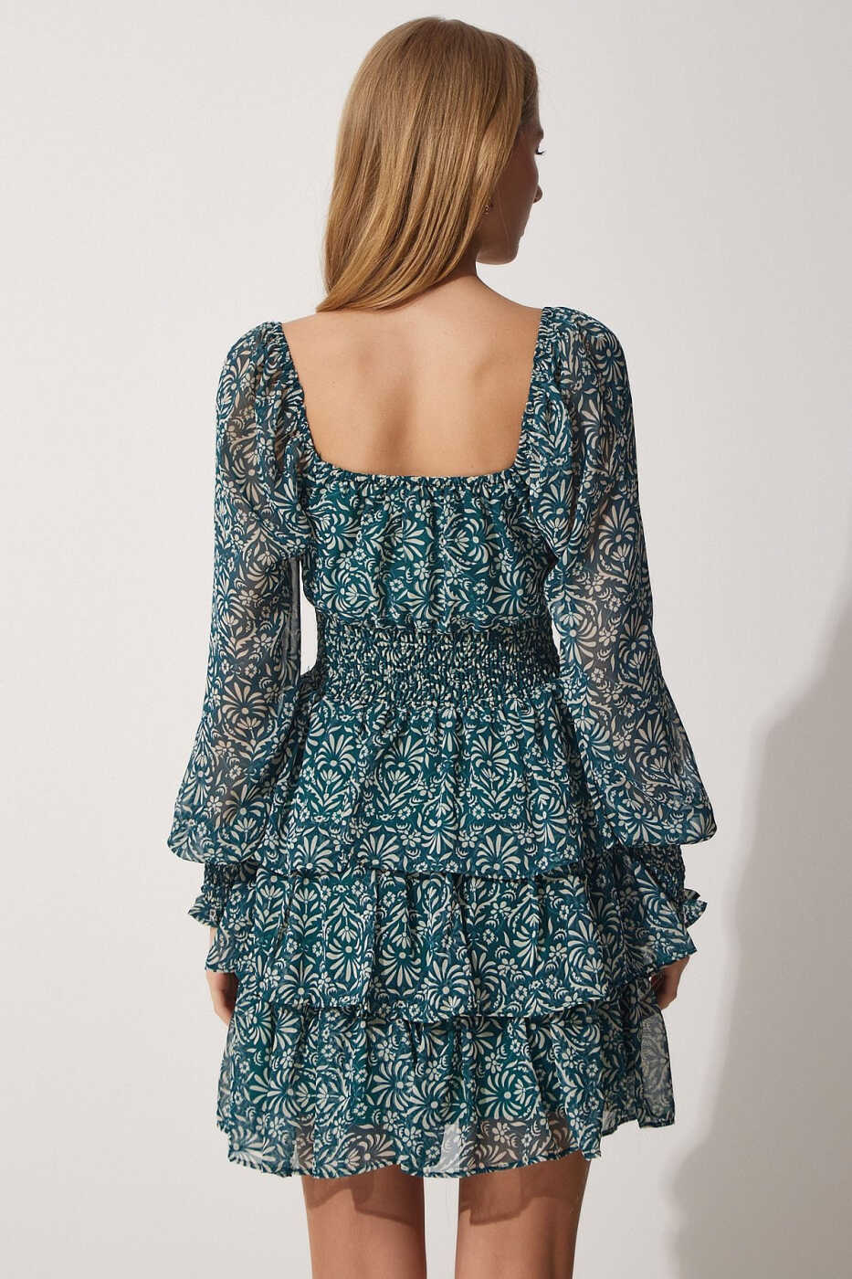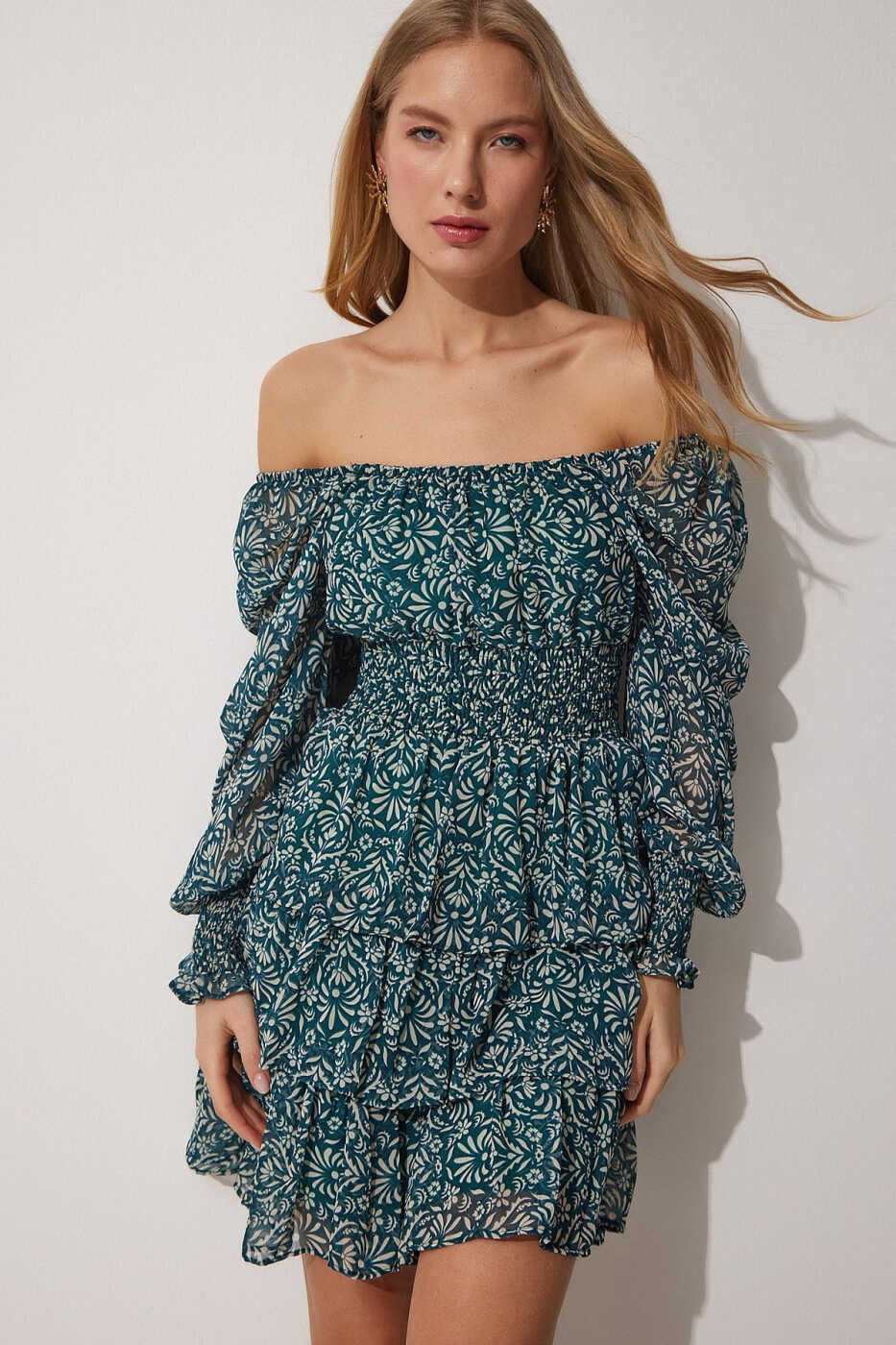 Женское шифоновое платье с зеленым цветочным принтом и вырезом "Кармен" DK001