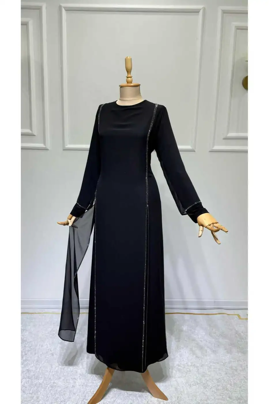 Поразите всех на ваших особых мероприятиях с этим потрясающим длинным шифоновым платьем с камнями, настоящей звездой нового сезона! Его изящный дизайн и ослепительные детали из камней привлекут все взгляды. Платье сочетает в себе комфорт и элегантность. Длинная шифоновая ткань идеально садится по фигуре, а дышащая структура обеспечивает комфорт в течение всего дня. Тщательно обработанные рукава с камнями и изящный воротник-стойка придают платью современный и утонченный вид. Благодаря однотонному дизайну, платье легко сочетается с различными аксессуарами. Дополните его элегантной сумочкой, изысканными украшениями и туфлями на каблуке, чтобы подчеркнуть свой стиль. Идеально подходит для свадеб, помолвок, выпускных вечеров и других торжественных мероприятий, это вечернее платье подойдет женщинам любого возраста. Это прекрасный выбор для тех, кто хочет выглядеть элегантно и современно одновременно, оно станет незаменимой частью вашего гардероба. Это эксклюзивное платье от Moda Minar ждет вас по выгодной цене. Рекомендуем сделать заказ прямо сейчас, так как количество товара ограничено!