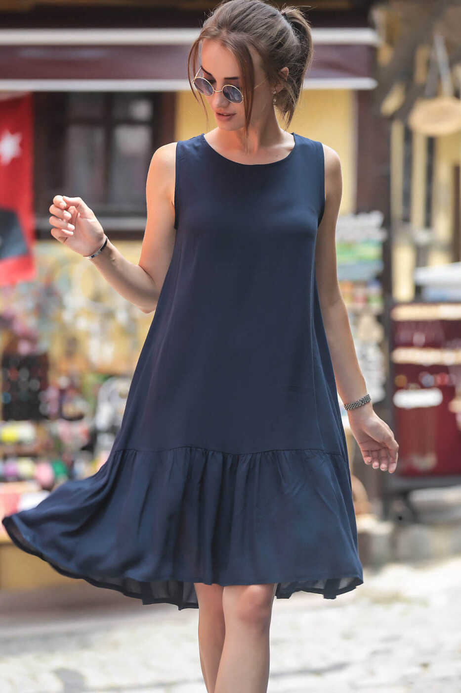 Женское платье без рукавов с воланами на юбке, темно-синего цвета – идеальный выбор для женщин, которые хотят выглядеть элегантно и стильно. Это платье станет одной из незаменимых деталей вашего гардероба благодаря темно-синему цвету, который подходит для любого сезона, а его дизайн без рукавов обеспечит комфорт в жаркую погоду. Воланы на юбке добавят изящества вашему стилю.