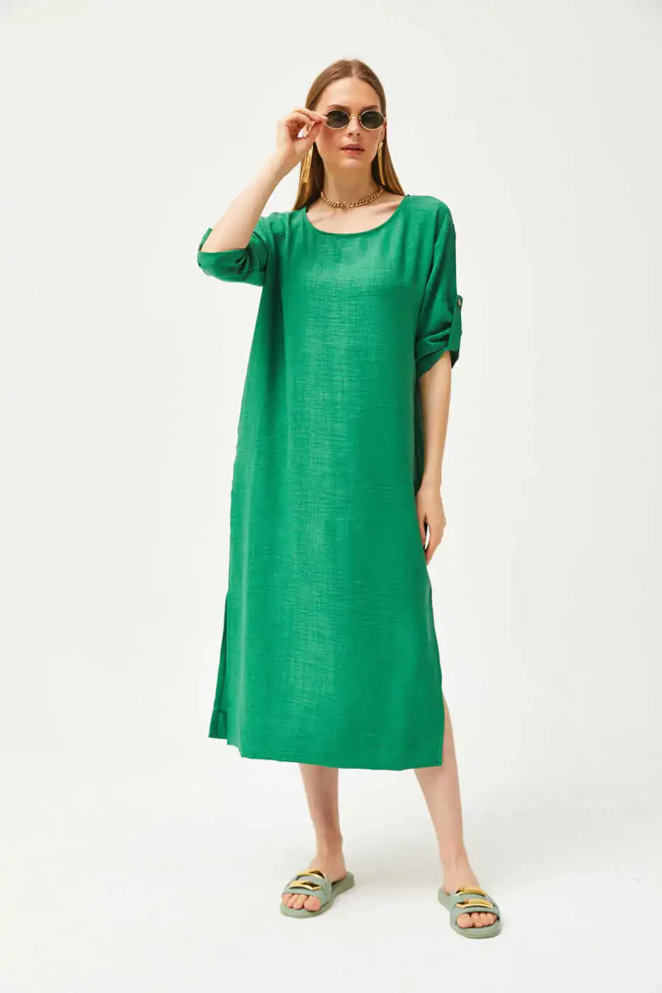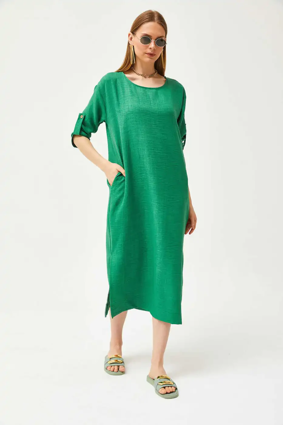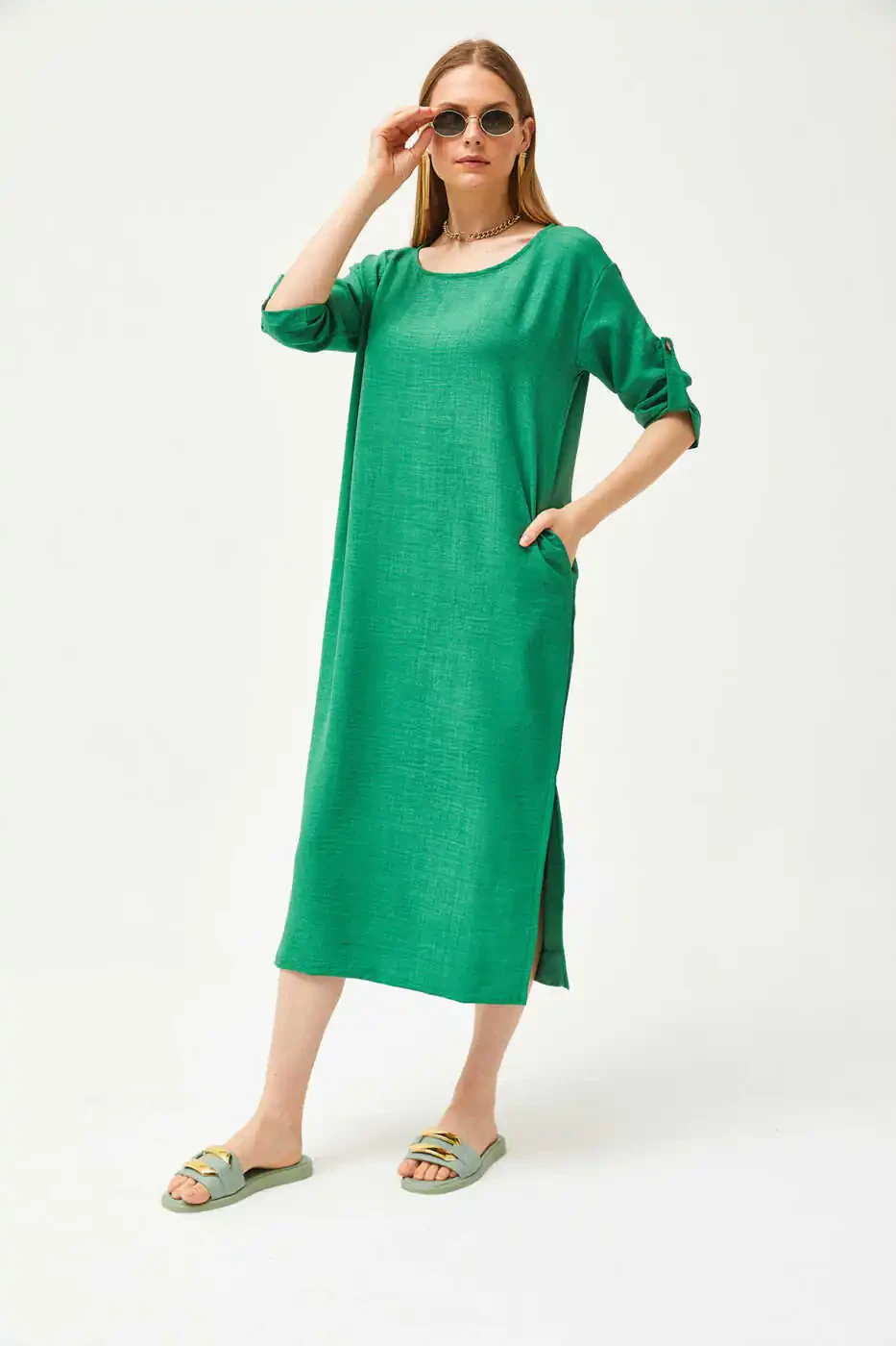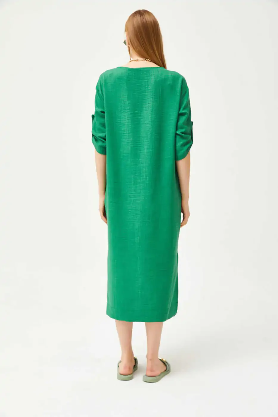 Познакомьтесь с свободным платьем из смеси льна, которое сочетает в себе комфорт и стиль летнего сезона! Модель ELB-19002074 обеспечивает комфорт в течение всего дня благодаря дышащей натуральной льняной ткани и свободному крою, а его зеленый цвет и детали карманов дополнят ваш образ. Асимметричный дизайн обеспечивает свободу движений, делая платье идеальным для повседневной носки, на пляже или по особым случаям, создавая стильный и комфортный образ.