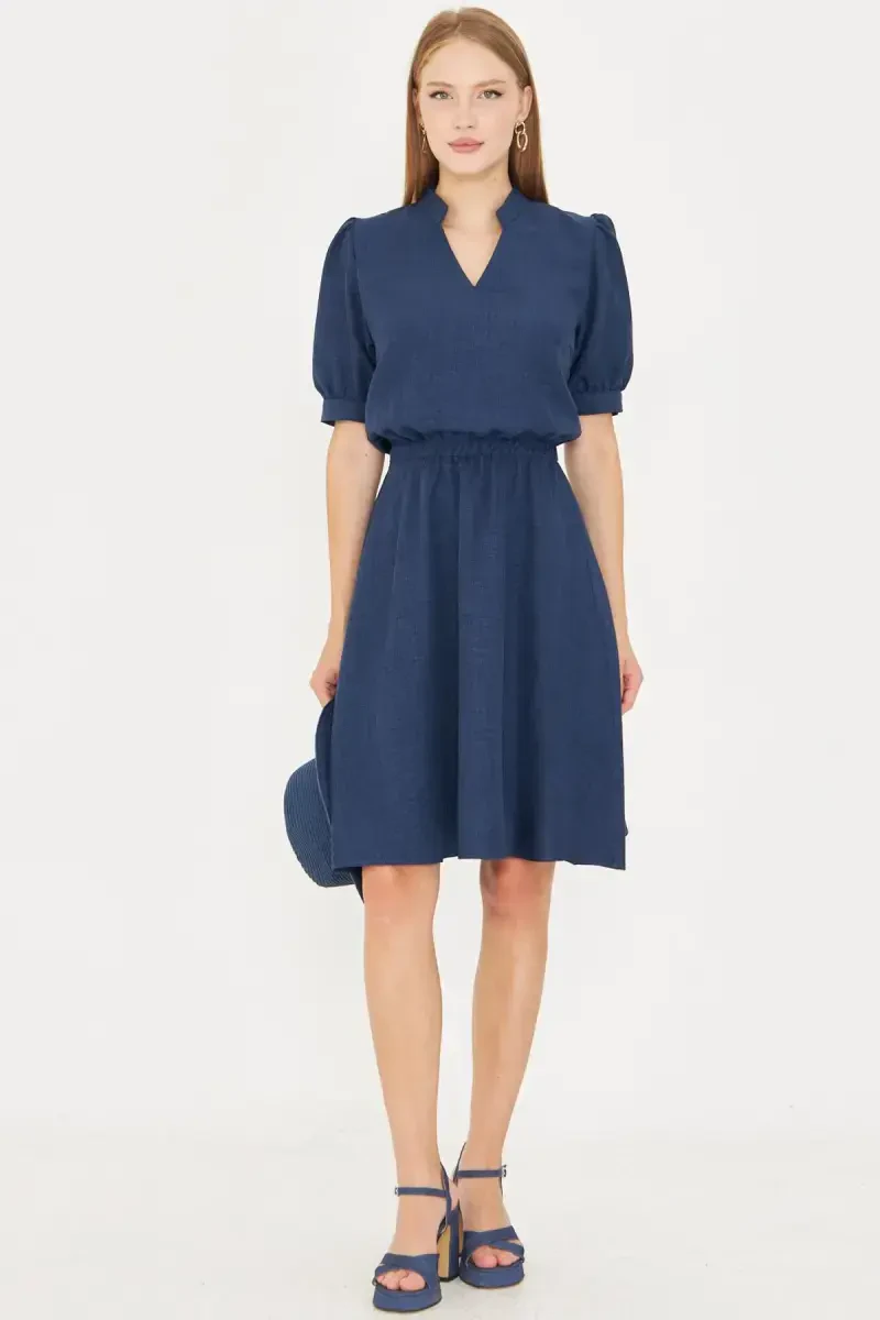 Синее платье-клеш с V-образным вырезом | Элегантное платье с короткими рукавами и эластичной талией