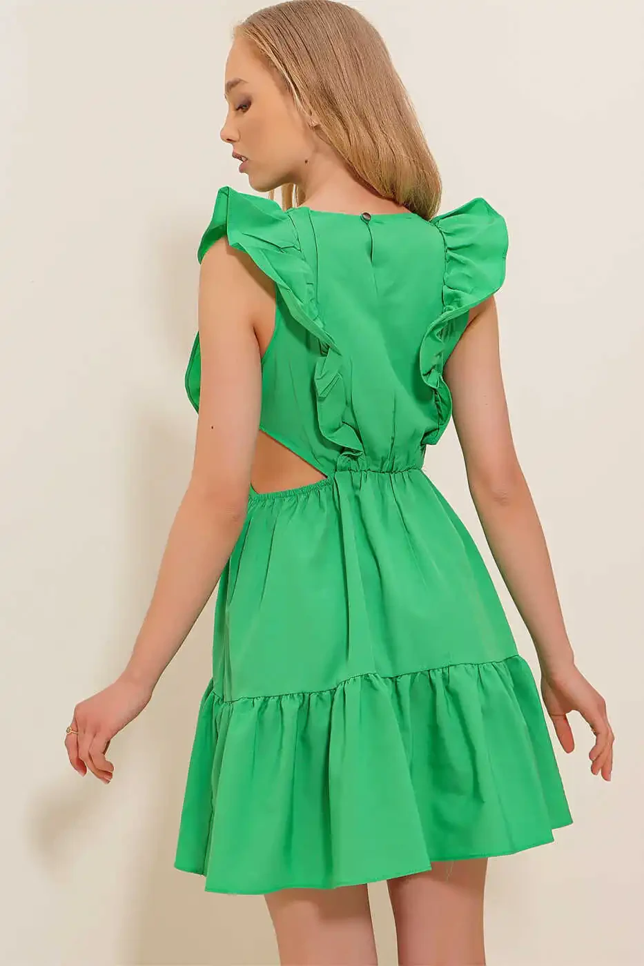 Станьте воплощением элегантности и комфорта в этом зеленом платье из поплина, которое сочетает в себе оба качества! Деталь выреза лодочкой, поясная линия декольте и воланы по бокам создают изящный силуэт, который сделает вас еще более чарующей. Это платье, которое вы можете выбрать для повседневных сочетаний или особых случаев, подойдет к любому стилю.