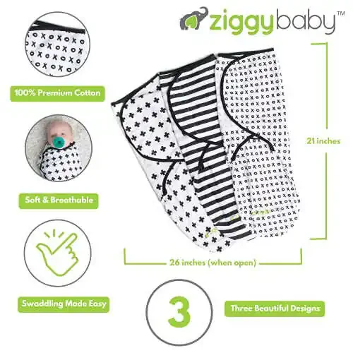 Ziggy Baby Ayarlanabilir Bebek Bebek Bebekleri 0-3 Ay - Battaniye Bebek Sarma Seti 3 Paket - Yumuşak Pamuk Siyah Beyaz - Yeni Doğan Bebek Bebekleri Erkek veya Kız İçin, Bebek Battaniyesi