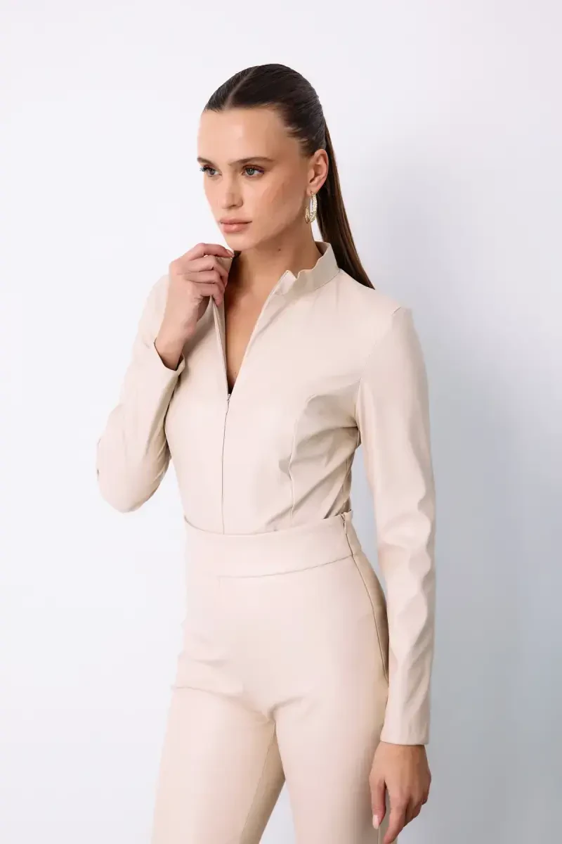 Combining style and boldness, the Zippered Leather Bodysuit - Stone is ready to be the most assertive piece in your wardrobe. Made with high-quality leather, the bodysuit will make you feel confident with its design that fits your body perfectly. The zipper on the front provides both a stylish detail and practical use. With its stone color, the bodysuit can adapt to any of your combinations, complementing your style from special occasions to everyday life.
