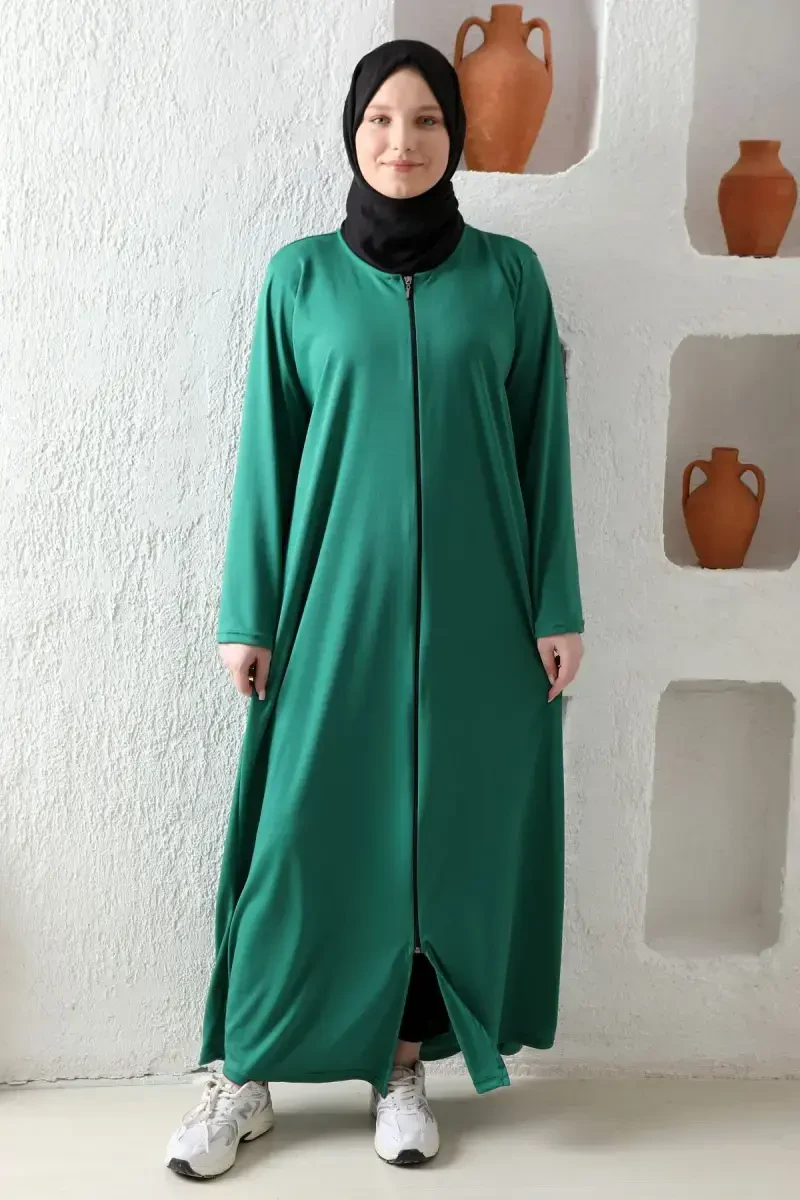 zippered abaya, seasonal abaya, light fabric, women's prayer dress, modest clothing, comfortable abaya, stylish abaya, green abaya, easy to wear, everyday abaya