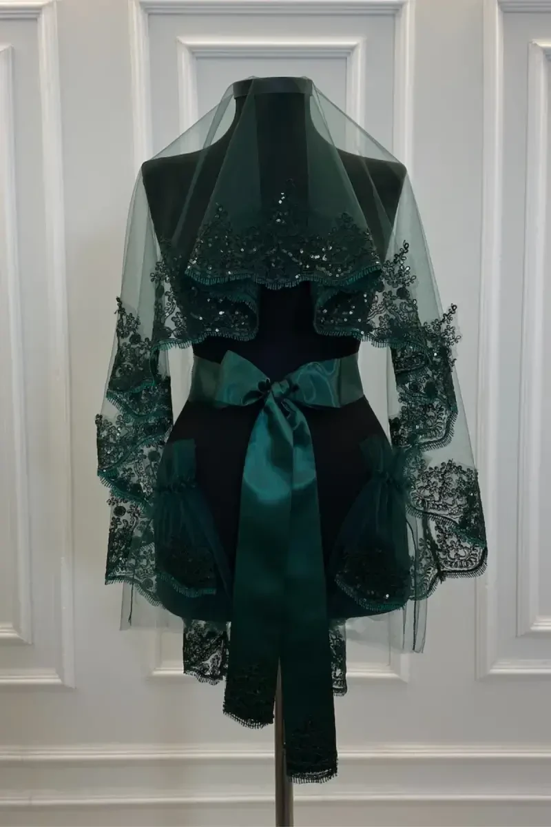 Изумрудно-зеленый блестящий набор для хны с кружевом, разработан, чтобы добавить неповторимую элегантность и великолепие вашей ночи хны. Этот специальный набор сочетает в себе традиционную концепцию хны с современным оттенком и станет самой яркой звездой ночи. Очаровательный оттенок изумрудно-зеленого цвета в сочетании с блеском кружевных деталей создает вид, который будет вызывать восхищение на каждом вашем шагу. Фата изготовлена из высококачественных материалов, легкая и удобная в использовании. Длинная и плавная структура добавляет элегантности вашим движениям, а блестящая вышивка на ней сверкает под светом и ослепляет. Подходящие аксессуары в наборе дополняют элегантность фаты и помогают достичь безупречной гармонии сверху донизу. Этот набор, который добавит тепла и волшебства в атмосферу вашей ночи хны, также является сувениром, который увековечит ваши незабываемые воспоминания. Каждая деталь изумрудно-зеленого кружевного набора для хны тщательно проработана и отличается качеством изготовления и эстетичным дизайном. Он идеально сочетается с вашим свадебным платьем и наилучшим образом подчеркнет вашу красоту и элегантность. С этим специальным набором вы почувствуете себя героиней сказки в ночь хны и создадите незабываемые воспоминания со своими близкими. Этот набор, сочетающий в себе благородство изумрудно-зеленого и блеск кружева, станет самой особенной и незабываемой частью вашей ночи хны. Выберите этот уникальный набор фаты, чтобы почувствовать себя особенной и ценной и сделать свою ночь хны незабываемой.