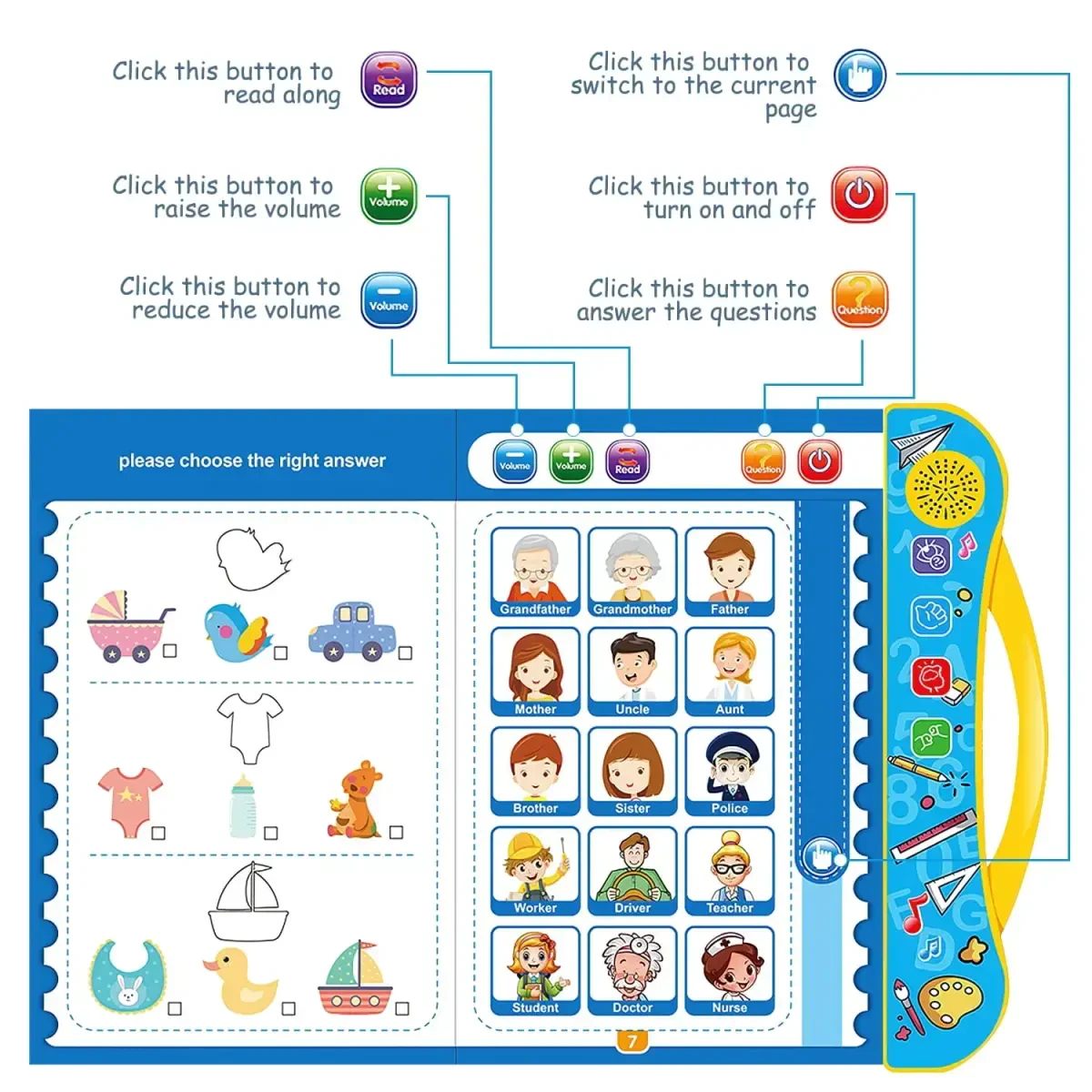 Представляем вам Sound Book Alphabet Toys, увлекательный и интерактивный способ обучения, который поможет в раннем развитии ваших детей! Изучая английские буквы, формы и многое другое, они будут одновременно развлекаться и учиться. Эта электронная интерактивная игрушка укрепит связь детей с книгами, привьет им любовь к учебе и поддержит их навыки самостоятельного обучения. Благодаря звукам и цветам в содержании дети будут активно участвовать в процессе обучения и в увлекательной форме изучать звуки букв, персонажей, животных, цвета и многое другое. Эта звуковая книга, разработанная специально для детей от 3 лет и старше, позволит им участвовать в обучающих мероприятиях, просто касаясь пальцами, и превратит обучение в увлекательное приключение.Эта развивающая игрушка помогает детям расширять словарный запас, учиться правописанию, узнавать животных и изучать цифры, а также является отличным инструментом для начала изучения английского языка. Ищете ли вы игрушки для развития речевых навыков у детей или хотите научить их буквам с помощью упражнений A B C, этот продукт станет лучшим выбором. Благодаря простоте использования и интерактивной структуре дети смогут самостоятельно открывать и изучать новое.Sound Book Alphabet Toys имеет идеальный размер для путешествий. Это отличный вариант для развлечения и обучения ваших детей во время длительных автомобильных поездок, семейных выездов или когда вам нужно заняться делами дома. Эта развивающая игрушка позволит детям долгое время играть, не отвлекаясь, и внесет положительный вклад в их процесс обучения. Благодаря удобству переноски и прочной конструкции вы можете брать ее с собой куда угодно.Sound Book Alphabet Toys — одна из лучших игрушек, которую можно подарить детям. Она заинтересует как девочек, так и мальчиков и подарит им увлекательный опыт обучения в волшебном мире звуков и цветов. Родители оценят образовательную ценность этой звуковой книги, а дети будут наслаждаться игрой и обучением. В комплекте идет стираемый маркер, который позволяет детям практиковаться снова и снова, делая процесс обучения еще более увлекательным. Таким образом, вы делаете экологичный выбор и поддерживаете творческие способности своего ребенка. Начните увлекательное путешествие обучения ваших детей с Sound Book Alphabet Toys!