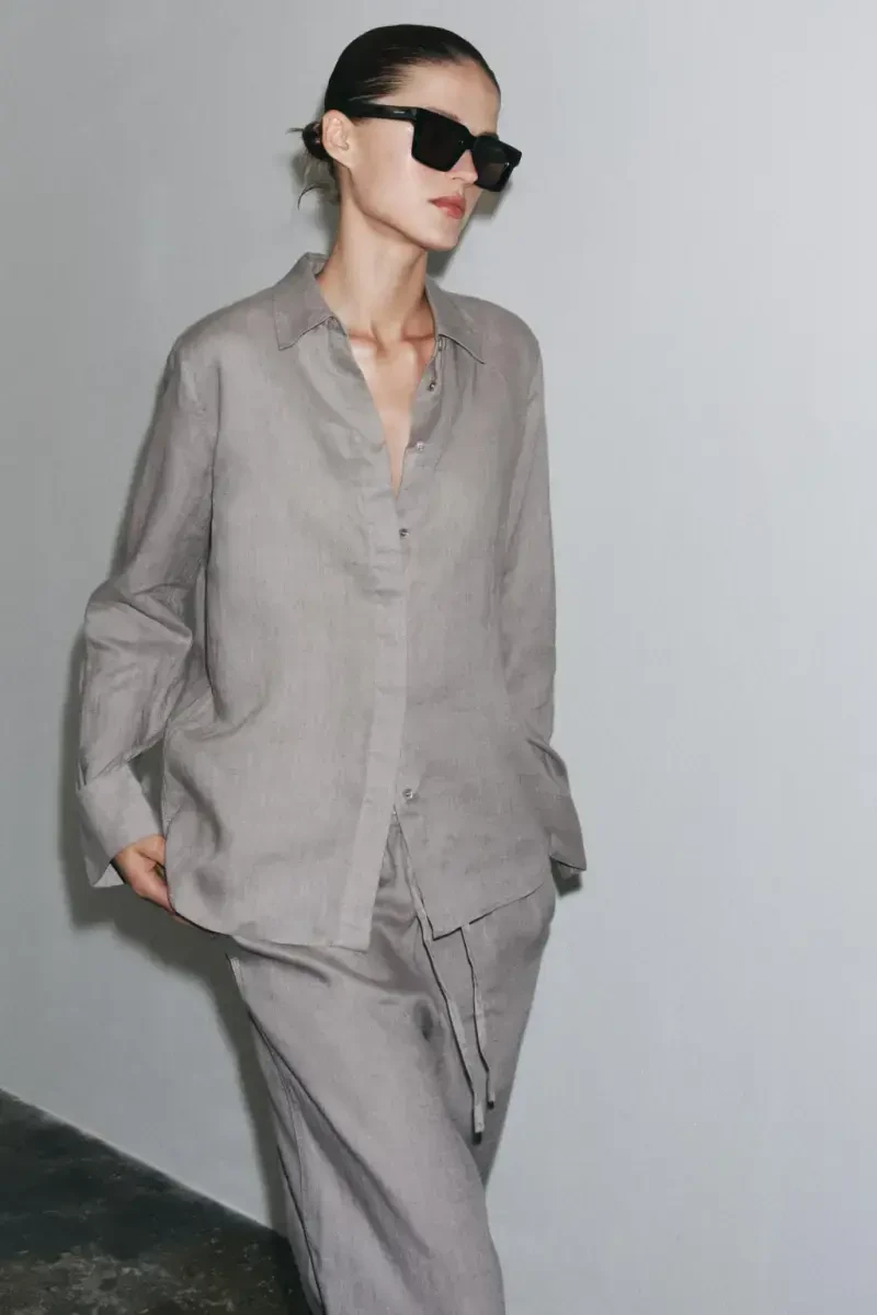 льняная рубашка, летняя рубашка, светло-серая рубашка, льняная ткань, дышащая рубашка, удобная рубашка, стильная рубашка, повседневная рубашка, рубашка для особого случая, натуральная ткань